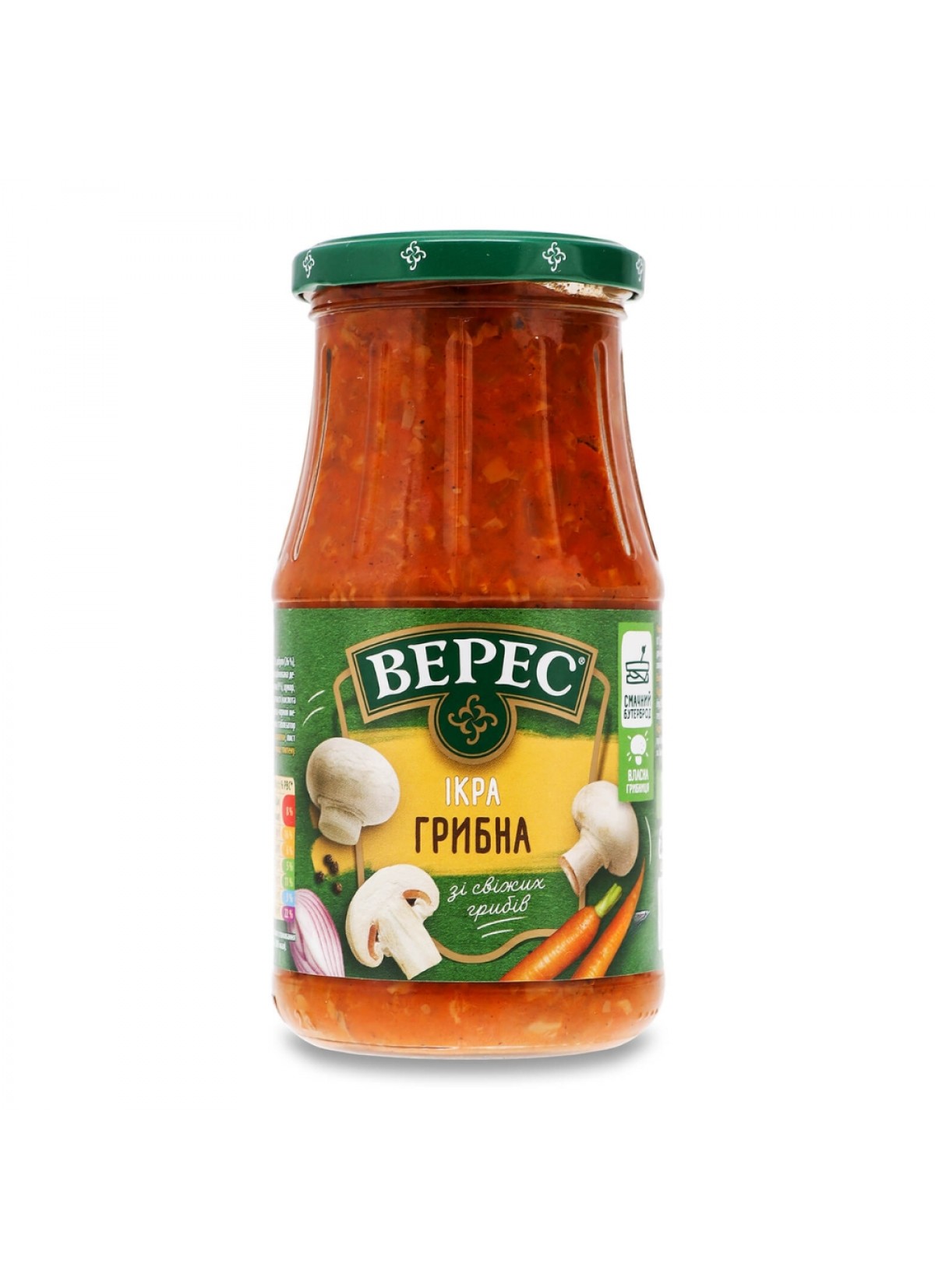 Грибна ікра «Верес» містить шматочки шампіньйонів. Тому вона є популярним інгредієнтом під час виготовлення начинки для млинців та пирогів, а також фарширування м’яса та овочів.