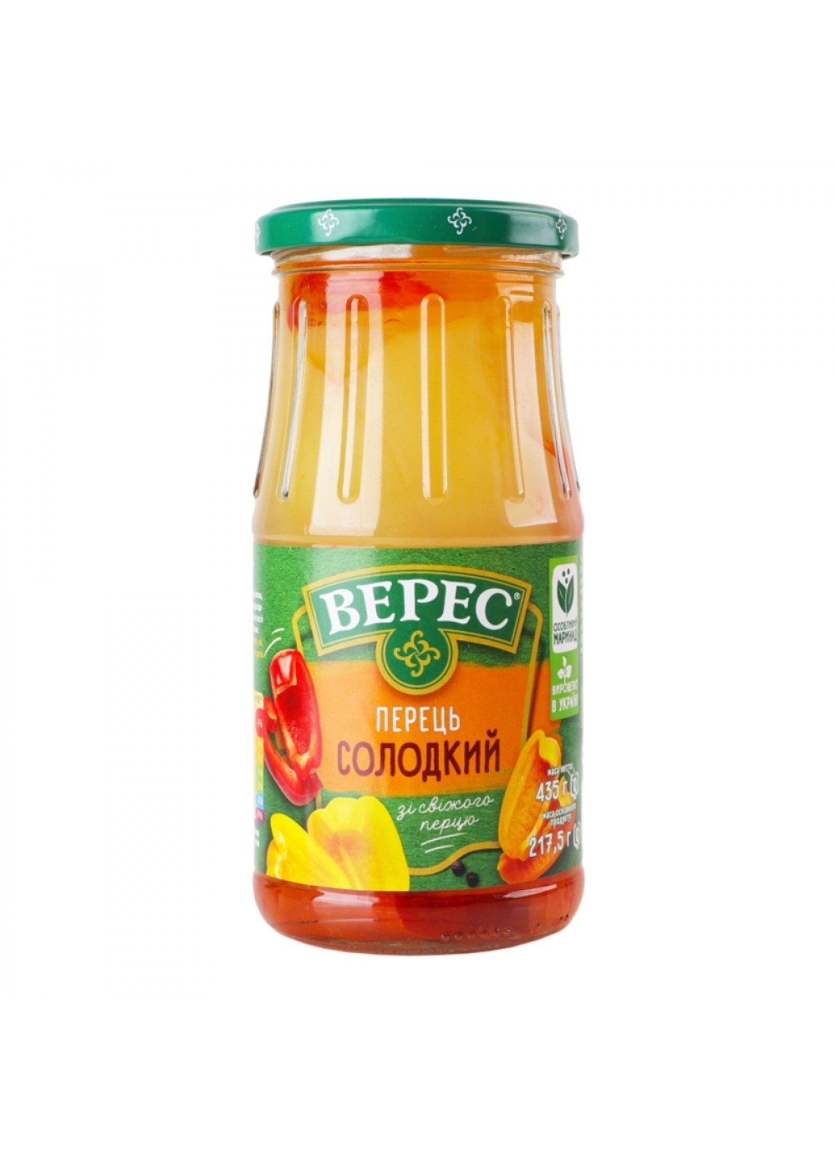 Склад: перець солодкий (50%), вода питна, цукор, олія соняшникова рафінована дезодорована, сіль кухонна, регулятор кислотності оцтова кислота, перець чорний горошок