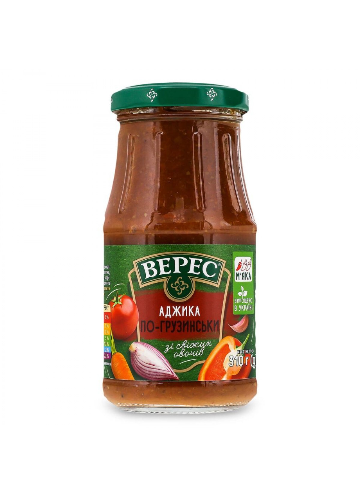 Состав: паста томатна, часник, перець, цибуля , коріандр, морква, пюре яблучне, перець солодкий, вода питна.сіль кухона.цукор.