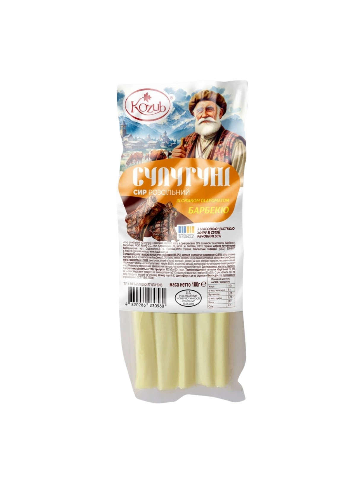Склад: Молоко коров'яче цільне (49%), молоко знежирене коров'яче (42.5%), сіль кухонна харчова (6%), ароматизатор барбекю (3%) (сіль, смако-ароматичні речовини натуральні ароматичні речовини, мальтодекстрин Е1400 , декстроза, сухий м'ясний екстрак, смаку та аромату глутамат натрію Е621), хлористий кальцій, молокозгортаючий ферментний препарат мікробіального походження, закваска чистих культур молочнокислих бактерій